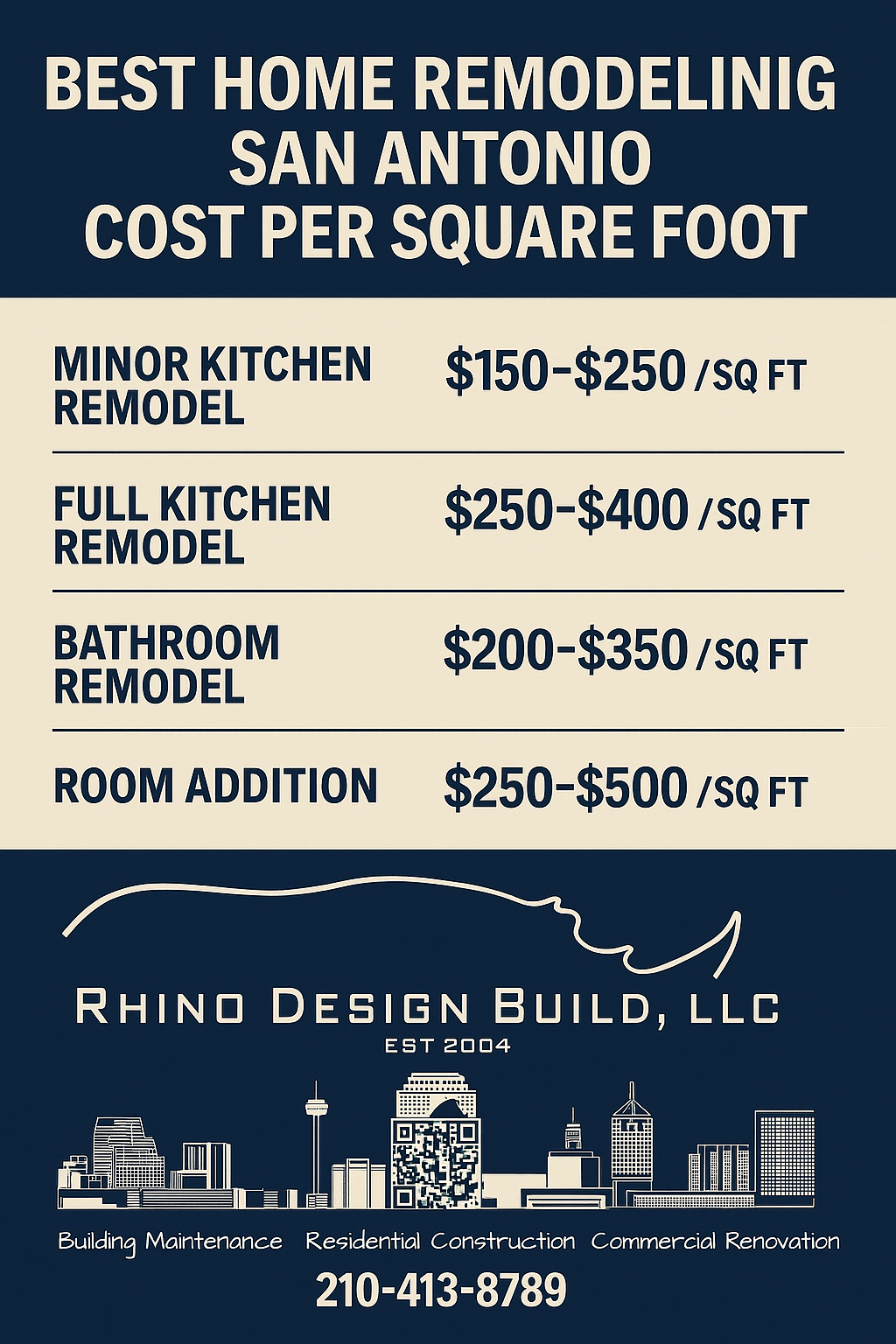 Want to know the real cost per square foot for your remodel? Call Rhino Design Build at 210-413-8789