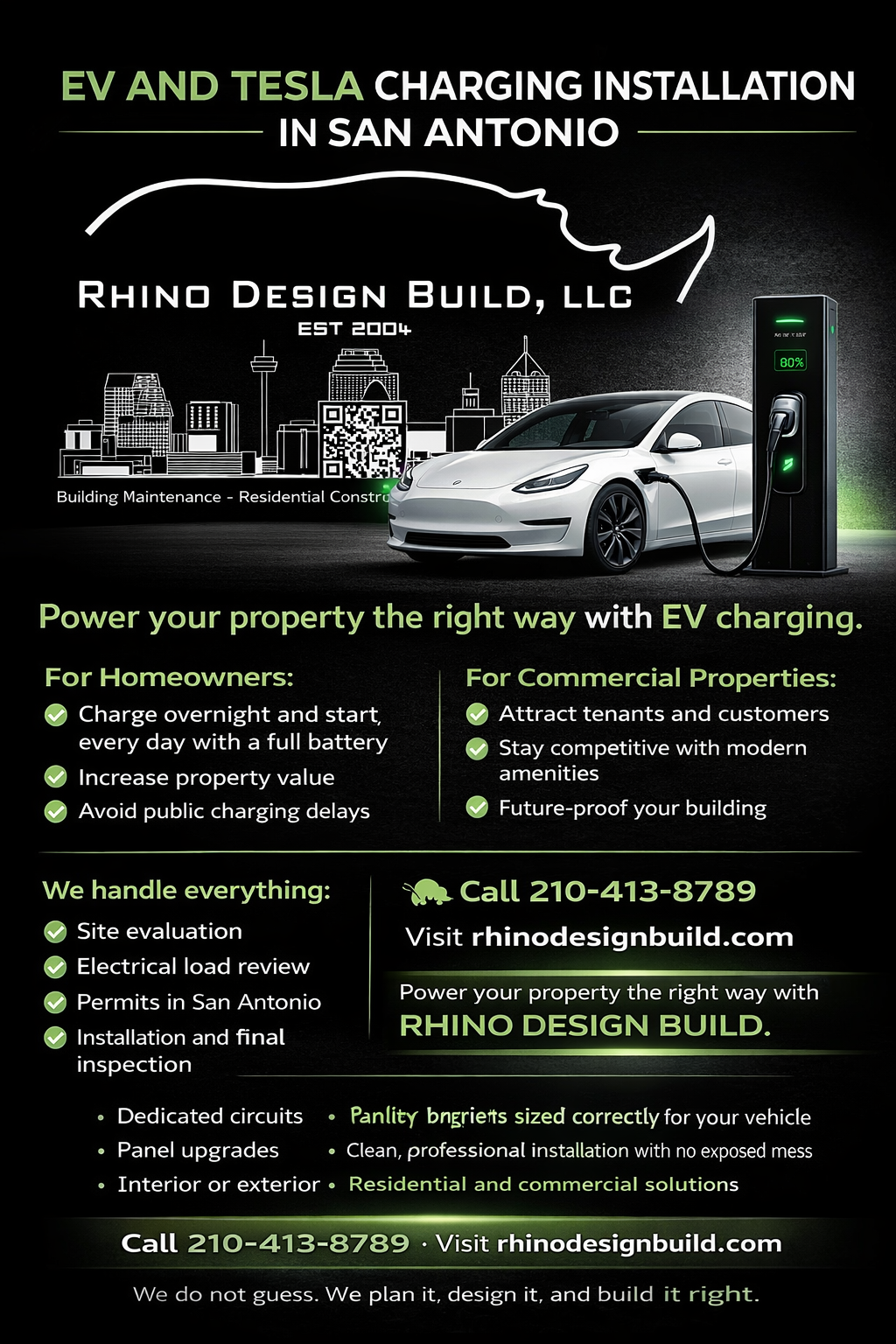 Rhino Design Build handles EV and Tesla charging installation from start to finish. We design it, size it correctly, and install it clean.